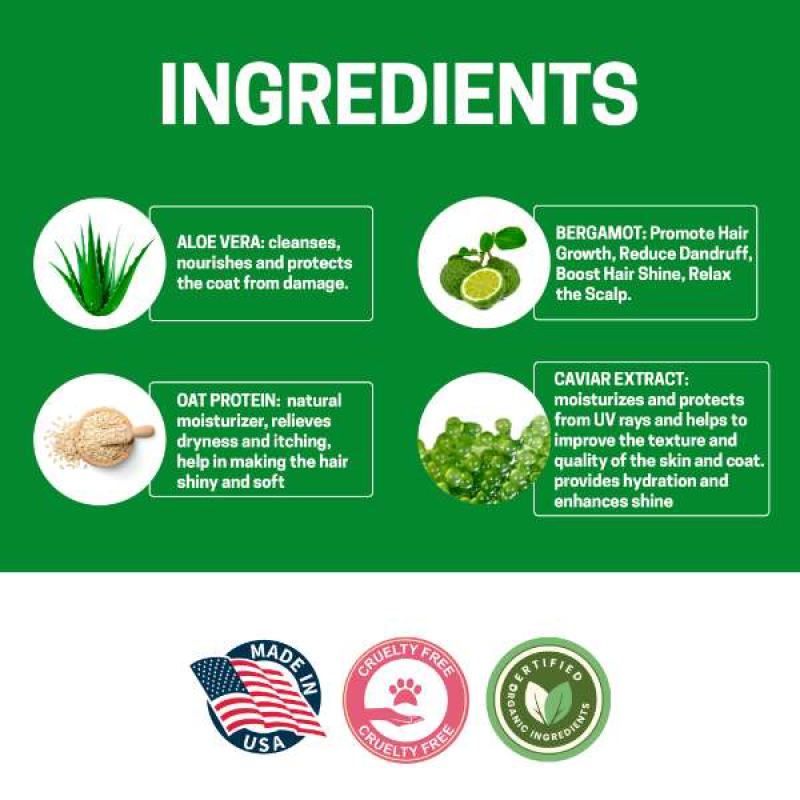 Nothing more beautiful than your dog's coat is abundant and bright. That is only accomplished with care and dedication.Green Coat Shampoo Beautiful Coathas an antioxidant and moisturizing effect on the hair, thanks to its high content of fatty acids, omega3, proteins, essential amino acids and a variety of vitamins A, B, iron and zinc, which in combination with oat protein, aloe vera and bergamot essential oil contain essential nutrients for the health of the scalp and hair. Dogs seem to pick up dirt everywhere, which is why a good bath, with a good dog shampoo is a must for dog owners. Our incredible shampoo for a beautiful coat, nourishes and conditions your dog's coat beautifully! Canine hair is not unlike human hair and responds best when natural products are used on it. Thank you for shopping at Victorypetsupply.com