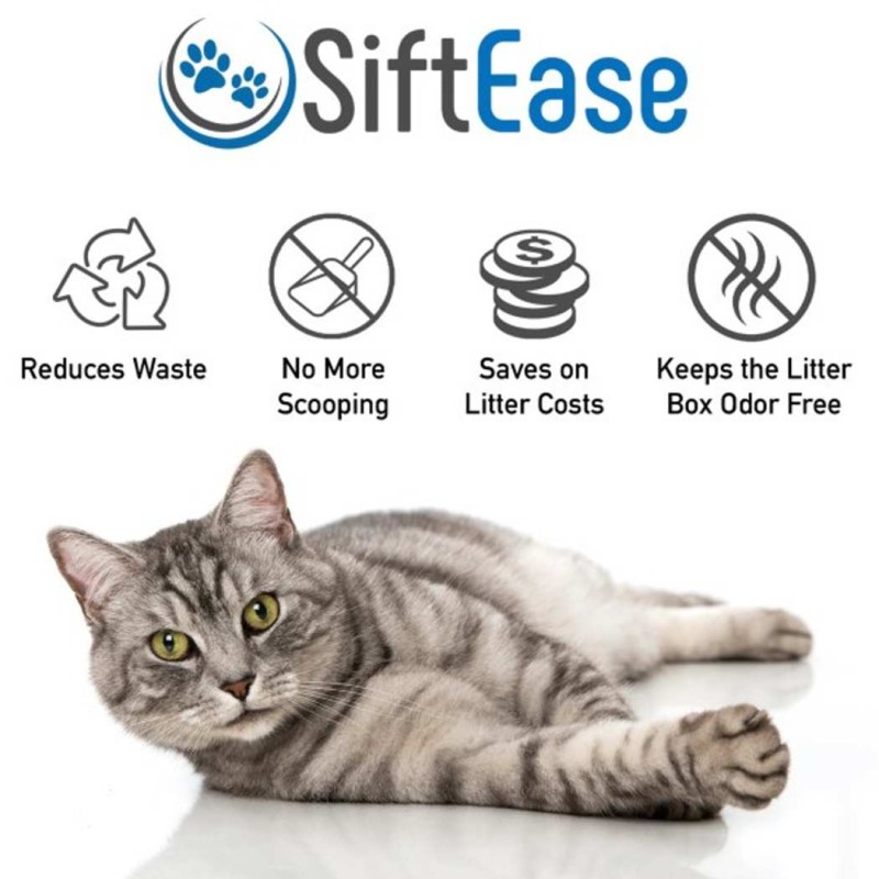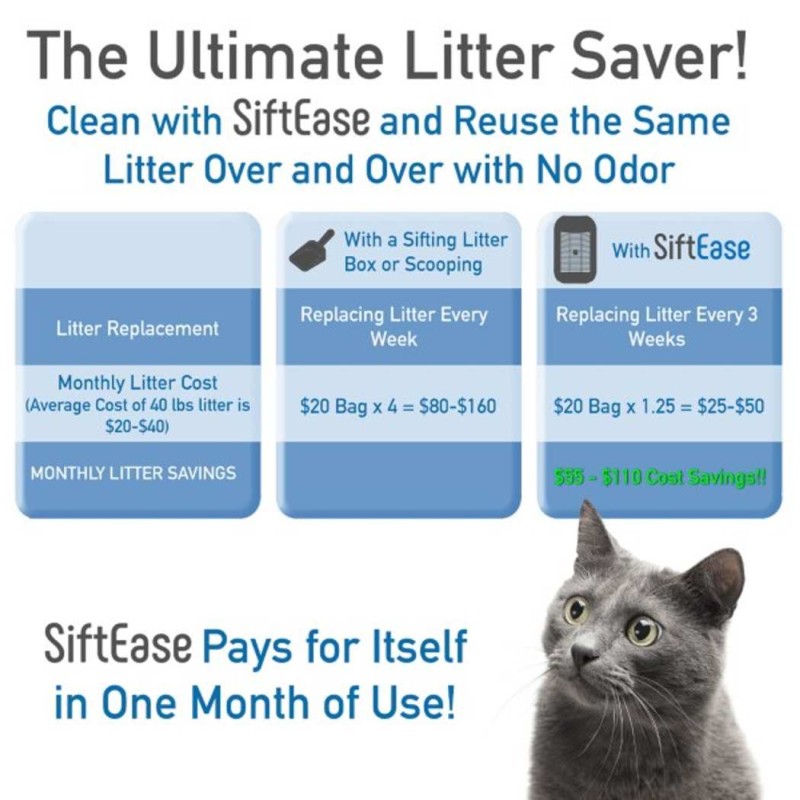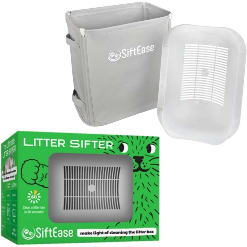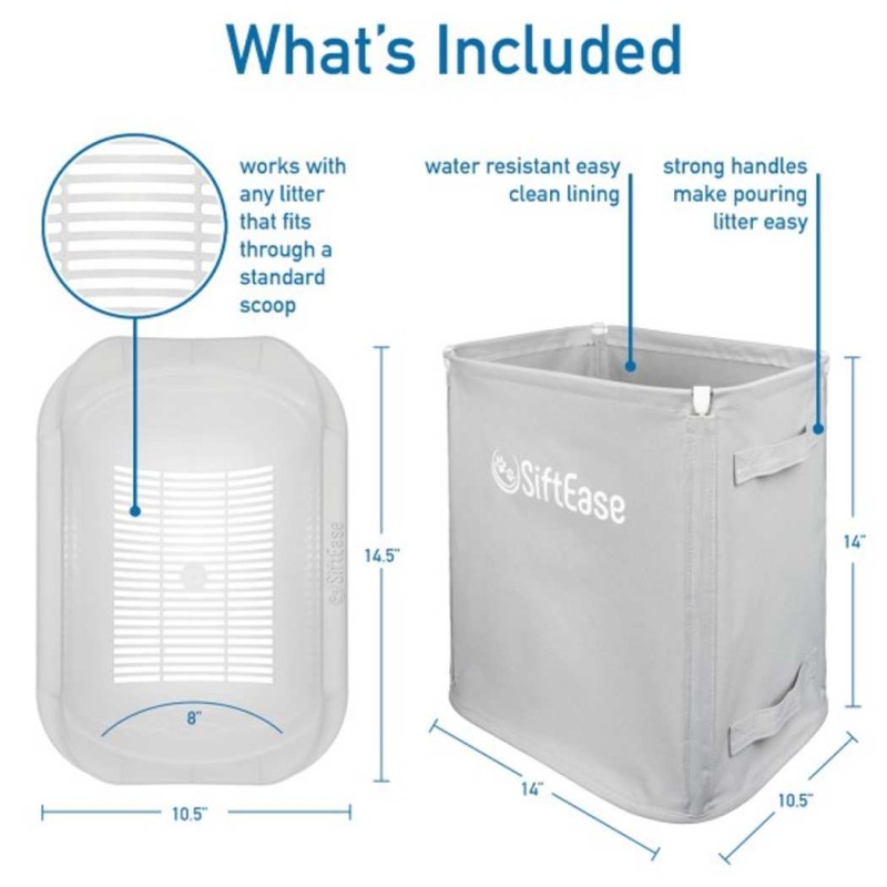 ELIMINATE LITTER BOX ODOR - Does the litter box stink even after you've cleaned it? This is because using a cat litter scoop to clean the litter box breaks up the stinky clumps and contaminates the clean litter. Sifting litter boxes don't work either because the clumps clog up the slots and make for a complicated stinky mess! USE SIFTEASE TO CLEAN YOUR LITTER AND STINK NO MORE!HOW DOES IT WORK? SiftEase is the best litter box accessory you'll ever buy! Simply pour the contents of the dirty litter box into SiftEase; waste stays in the upper sifting basket while clean litter passes through to the bin below. Then lift the basket and dispose of the waste all at once in a bin or waste bag and pour the clean litter back into the box. No more litter scatter mess or painful bending over to scoop!SAVE TIME AND MONEY - With SiftEase, you'll save time because instead of scooping or sifting, cleaning the litter box is now as easy as pouring the nasty out and the clean litter back in. And because clean litter doesn't stink, you'll be able to use the same litter over and over saving you money. WHAT ARE YOU WAITING FOR? TRY SIFTEASE TODAY AND SAVE TIME, MONEY, MESS, and ODOR!KEEP KITTY HAPPY AND HEALTHY - We know you don't like cleaning the litter box, but imagine how your cat feels when entering the scary temple of doom that hasn't been cleaned in awhile. Clean litter keeps helps with behavioral problems of the cat skipping the box and you'll love how easy this chore is with SiftEase. Most of all, you and your cat will notice after using SiftEase that the litter box doesn't stink anymore! Odor free makes everyone happy!HAVE MULTIPLE LITTER BOXES OR A LARGE LITTER BOX? No worries, once you get used to the SiftEase method you'll be able to clean several litter boxes at once in just a few minutes compared to the time it used to take to manually search for treasures with a scoop or take apart that self cleaning litter box or automatic litter box to clean it. Large litter boxes work just as well. If you can lift it, you can use SiftEase to clean itNo More Scooping | Works with Any Cat Litter Box to Clean Litter, Eliminate Odors, and Allows Reuse of the LitterLitter Sifter works with any litter box to make clean up a breezeSimply pour the contents of the dirty litter box into SiftEase and the 7" deep sifting basket will separate the stinky waste from the clean litter which passes through to the holding bin belowUnlike scooping, pouring kitty litter through SiftEase prevents the stinky clumps from breaking apart and contaminating the rest of the clean litter, this eliminates the odors and lets you use that litter over and over again SAVING YOU TIME AND MONEY!At Clean Litter Club, we know your pets are your family and you want to take care of them. Keeping your cats litter box clean and odor-free will make both of you happy!With SiftEase, cleaning the litter box is as easy as pouring the dirty litter out and putting clean litter back in. You'll be amazed at how fast and efficient this chore becomes.SiftEase works with any litter box that can be lifted and poured out and with any litter that fits through a scoop. Most cat owners are like us and have given up on the automatic and sifting litter boxes because they don't work! Litter goo gets stuck on leaving a complicated mess. GROSS!Give your cat a litter box that they'll love by simply cleaning it every other day with SiftEase. The chore will be easy and the odors will be gone for good. No more scooping, rolling or taking apart a complicated litter box to clean it.What's Included?Sifting Basket (14.5"L x 10.5"W x 7"H)Holding Bin 28 Qt (14.5"L x 10.5"W x 15"H) Thank you for shopping at Victorypetsupply.com