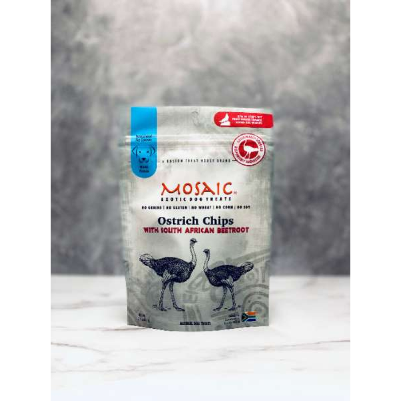 Mosaic South African Ostrich Chips are a perfect alternative for dogs that are affected by food allergies from common proteins, such as chicken, beef, and pork. These limited-ingredient, tasty treats are low in fat and low in calories, which may benefit dogs that suffer from weight control issues. Our exotic chips are infused with South African beetroot, which is a great source for Vitamin C, fiber, manganese, folate, and potassium.
