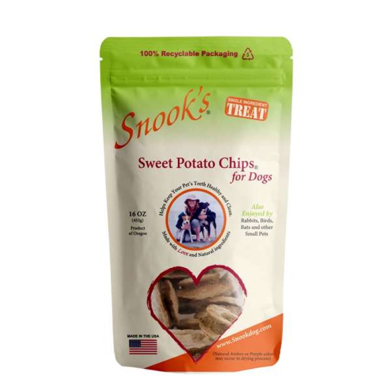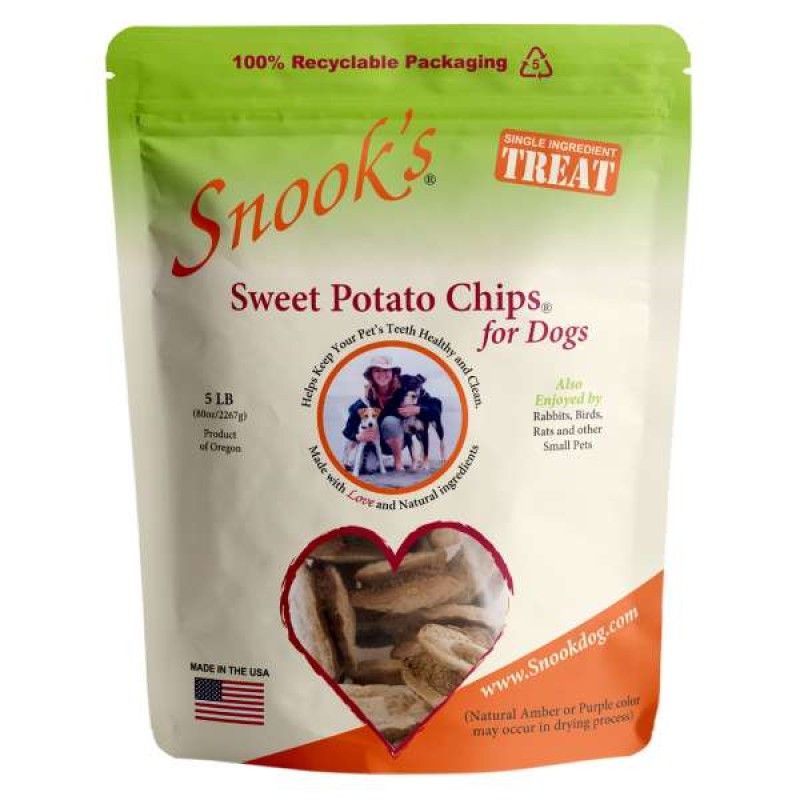 Snook's Sweet Potato Dog Chips are made from GMO Free Dried Golden Sweet Potatoes.