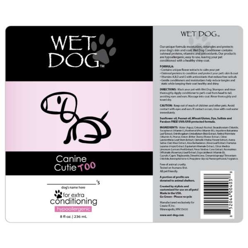 Wet Dog Canine Cutie Conditioner moisturizes, detangles and protects your dog's skin and coat. Our unique formula contains calming flower extracts so your pet can enjoy their spa treatment right at home. Our dog shampoos & conditioners are hypoallergenic, easy to use, leaving your pet conditioned, calm and content. Canine Cutie Conditioner contains oatmeal protein, vitamins and antioxidants to protect your dog until their next treatment. FREE OF ANIMAL CRUELTY - TESTED ON HUMANS FIRST - 100% PET FRIENDLY Thank you for shopping at Victorypetsupply.com