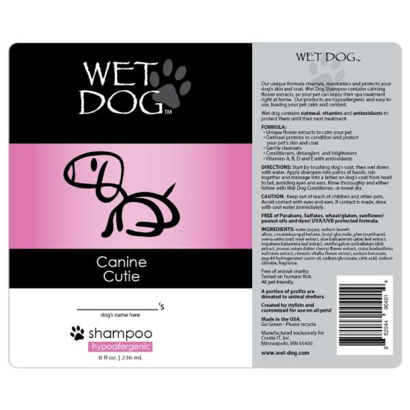 Wet Dog Canine Cutie Shampoo moisturizes, detangles and protects your dog's skin and coat. Our unique formula contains calming flower extracts so your pet can enjoy their spa treatment right at home. Our dog shampoos & conditioners are hypoallergenic, easy to use, leaving your pet conditioned, calm and content. Canine Cutie Shampoo contains oatmeal protein, vitamins and antioxidants to protect your dog until their next treatment. FREE OF ANIMAL CRUELTY - TESTED ON HUMANS FIRST - 100% PET FRIENDLY Thank you for shopping at Victorypetsupply.com
