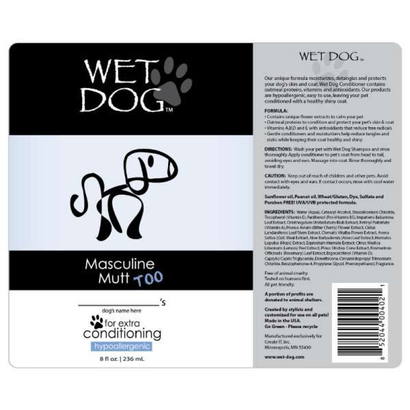 Wet Dog Masculine Mutt Conditioner moisturizes, detangles and protects your dog's skin and coat. Our unique formula contains calming flower extracts so your pet can enjoy their spa treatment right at home. Our dog shampoos & conditioners are hypoallergenic, easy to use, leaving your pet conditioned, calm and content. Masculine Mutt Conditioner contains oatmeal protein, vitamins and antioxidants to protect your dog until their next treatment. FREE OF ANIMAL CRUELTY - TESTED ON HUMANS FIRST - 100% PET FRIENDLY Thank you for shopping at Victorypetsupply.com